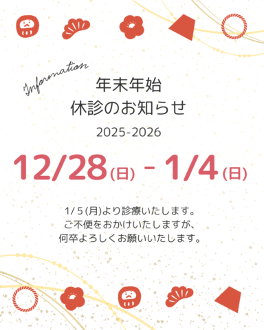 12月28日(日)〜1月4日(日)まで休診いたします。